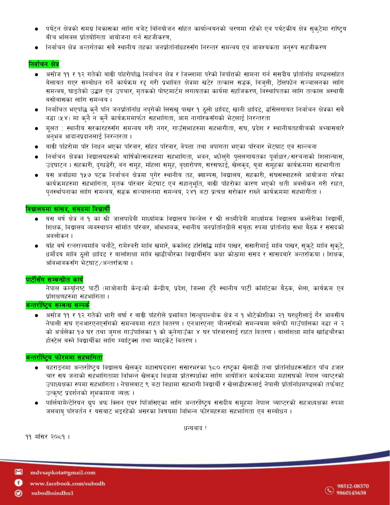 बाढी पहिरोबाट प्रभावित क्षेत्रका नागरिकलाई राहत र पुनःस्थापनाका लागि गैरआवासीय नेपाली संघ (एनआरएन) र अन्य निकायहरूसँग समन्वय गरी आवश्यक सहयोग पुर्याएको, विद्यालयमा सांसद, संसदमा विद्यार्थी कार्यक्रम सञ्चालन गरी विद्यालयमा गएर कक्षा लिएको र विद्यार्थीलाई संसद अवलोकनमा लगेर सांसद र संसदबारे जानकारी गराएको, तथा विभिन्न विकास निर्माण परियोजनाहरूको अनुगमन र सहजीकरण गरेको विवरणमा उल्लेख छ । सांसद सापकोटाले आगामी दिनमा पनि मतदाताहरूप्रति उत्तरदायी भएर काम गर्ने प्रतिबद्धता व्यक्त गरेका छन्।
